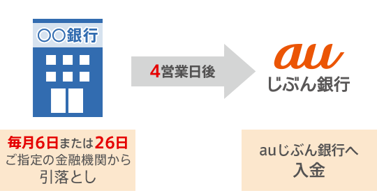 定額自動入金サービスでのauじぶん銀行口座への入金日は、原則引落日の4営業日後(引落日は含めない)です。
