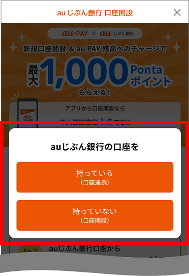 画面内の[持っていない(口座開設)]を選択するか、auじぶん銀行アプリをダウンロードし、口座開設のお申込みをお願いします。