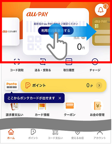 1.「au PAY アプリ」を起動し、トップ画面の上部を右方向にスワイプして、auじぶん銀行を表示させます。